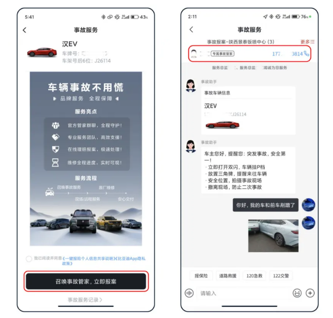 IT之家从比亚迪汽车公告获悉,用户一键召唤事故服务,可秒速接入官方专属服务群。专属事故管家24小时在线支援,全程指导事故处理。