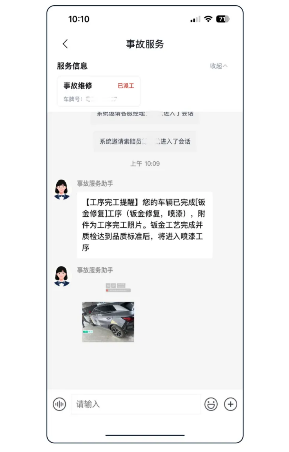 汽车进店维修时,群内将动态展示维修进度。关键修复工艺的照片在群内自动同步。